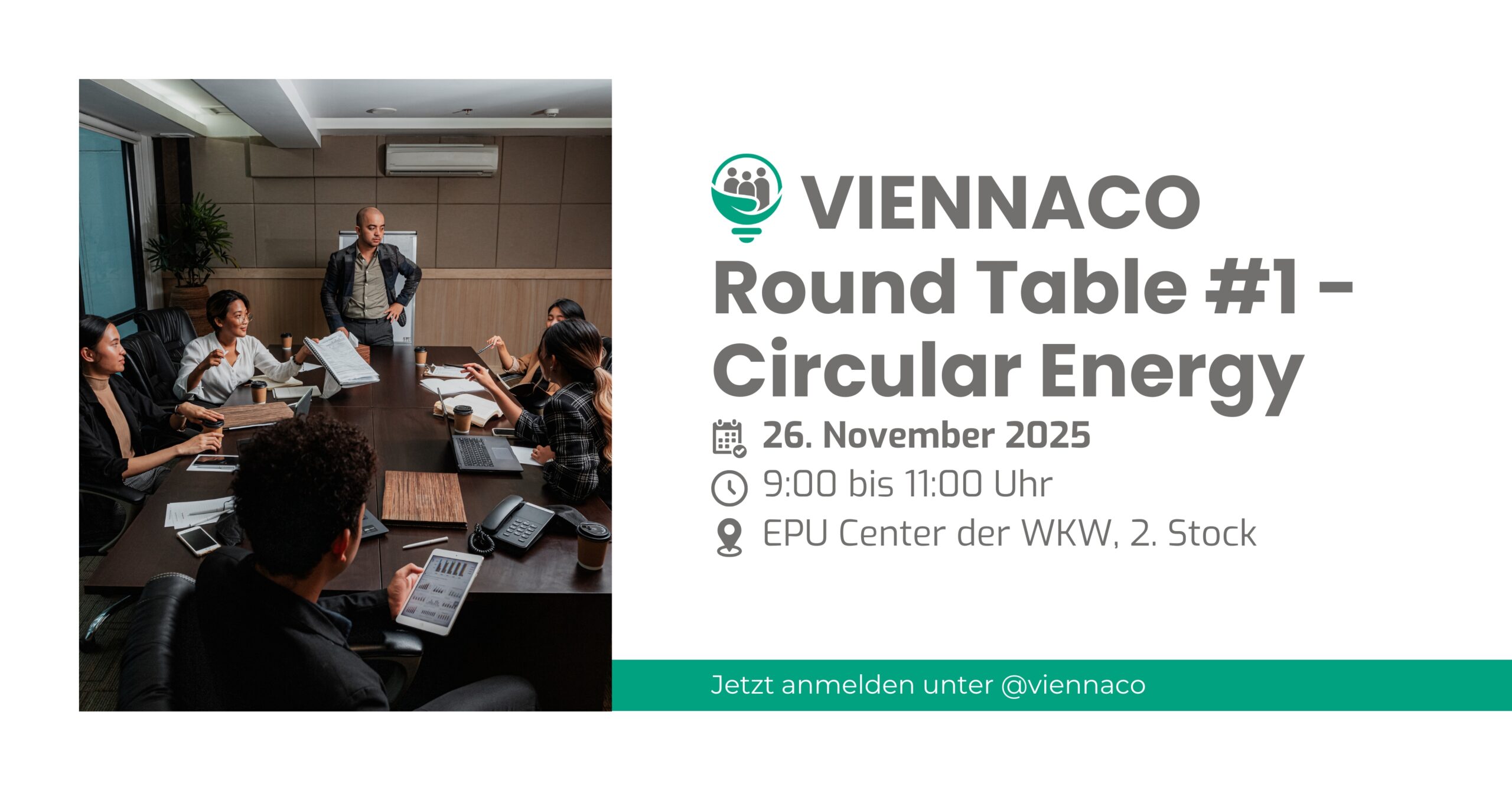 Forum EPU WKW Straße der Wiener Wirtschaft 1, WienCircular Energy - Batteriespeicher Die Energiewende stellt Unternehmen vor zentrale Fragen: Wie entwickeln sich moderne Batteriespeicher? Welche Technologien setzen neue Standards? Und welche Chancen ergeben sich daraus – für Industrie, KMU und nachhaltige Kreislaufsysteme? Der erste VIENNACO Roundtable gibt Expert:innen eine Plattform, um über aktuelle Entwicklungen, Best Practices und wirtschaftliche Potenziale rund um Energiespeicher zu […]